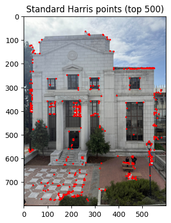 The Harris Corner Detector identifies points of strong local intensity variation. Using the provided harris.py helper, I detected corners and visualized them on each input image.