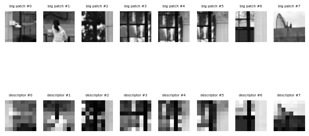 For each detected corner, I sampled a 40×40 window centered on the feature downsampled to an 8×8 descriptor. Each patch was bias/gain normalized to zero mean and unit variance, improving robustness to illumination changes.
