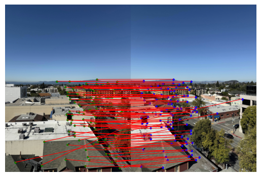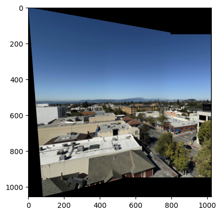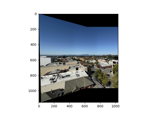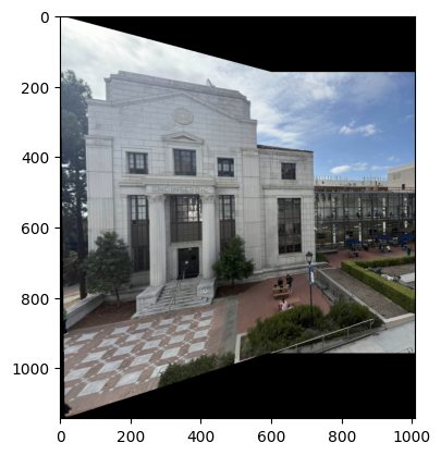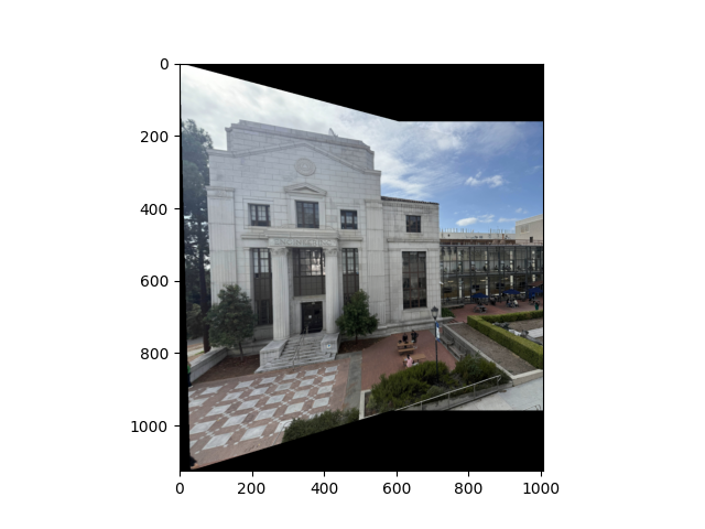 im1and the original corners ofim2are combined to determine the overall mosaic bounds. The output canvas size is set to encompass both. - Warping via Bilinear Interpolation: The first image is warped into the mosaic coordinate frame using inverse mapping and bilinear interpolation.