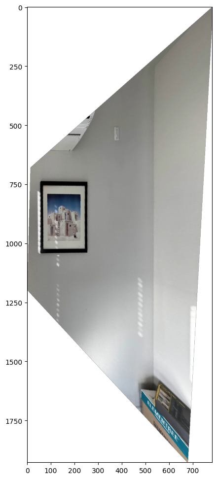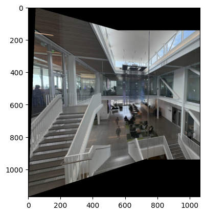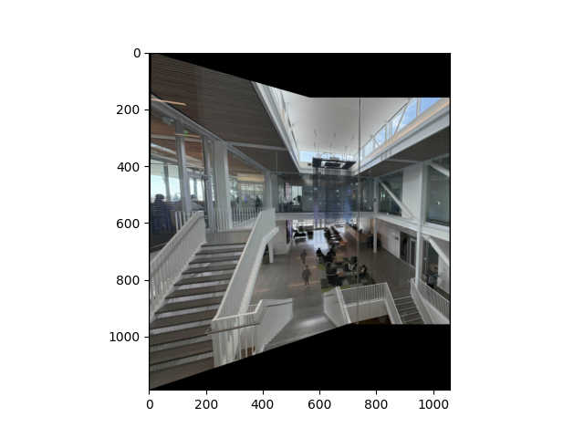 His computed using corresponding feature points between the two images. This transformation maps pixels from the first image into the coordinate system of the second image. - Canvas Determination: The warped corners of